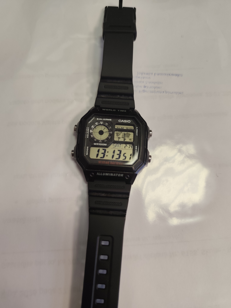 Meklē attēlā redzamā pulksteņa "CASIO" īpašnieku, kas atrasts 19.01.2026. vilcienā Nr.6155 Skulte-Rīga.