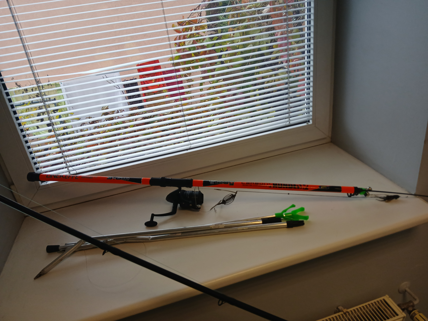 Jelgavā, Lielupes krastā atrastas divas makšķeres, Base pole fiber melnbalta, Lineaeffe oranža, divi makšķeru balsti.