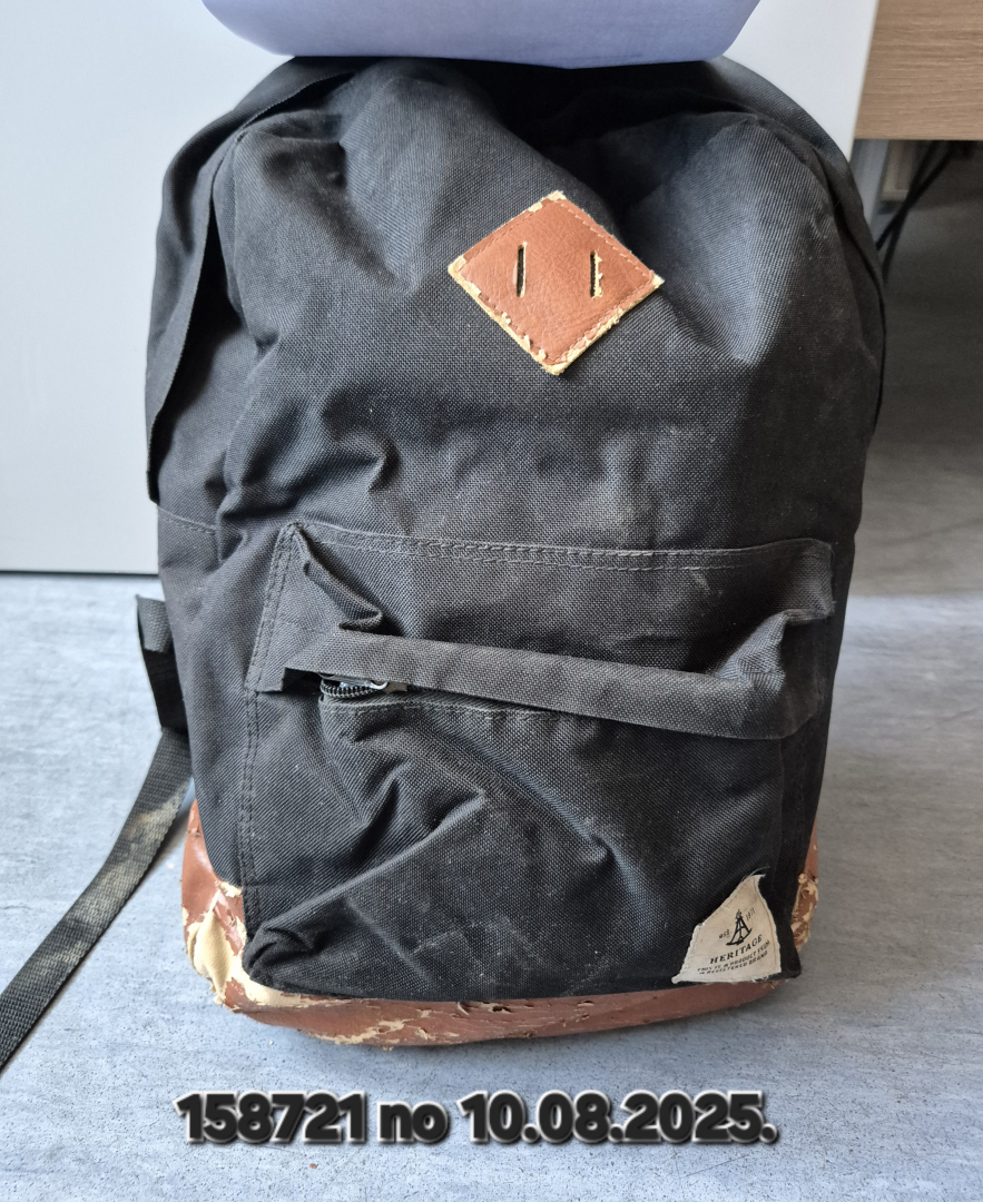 Mugursoma tika atrasta 10.08.2025. Merķeļa ielā 12, Rīgā.