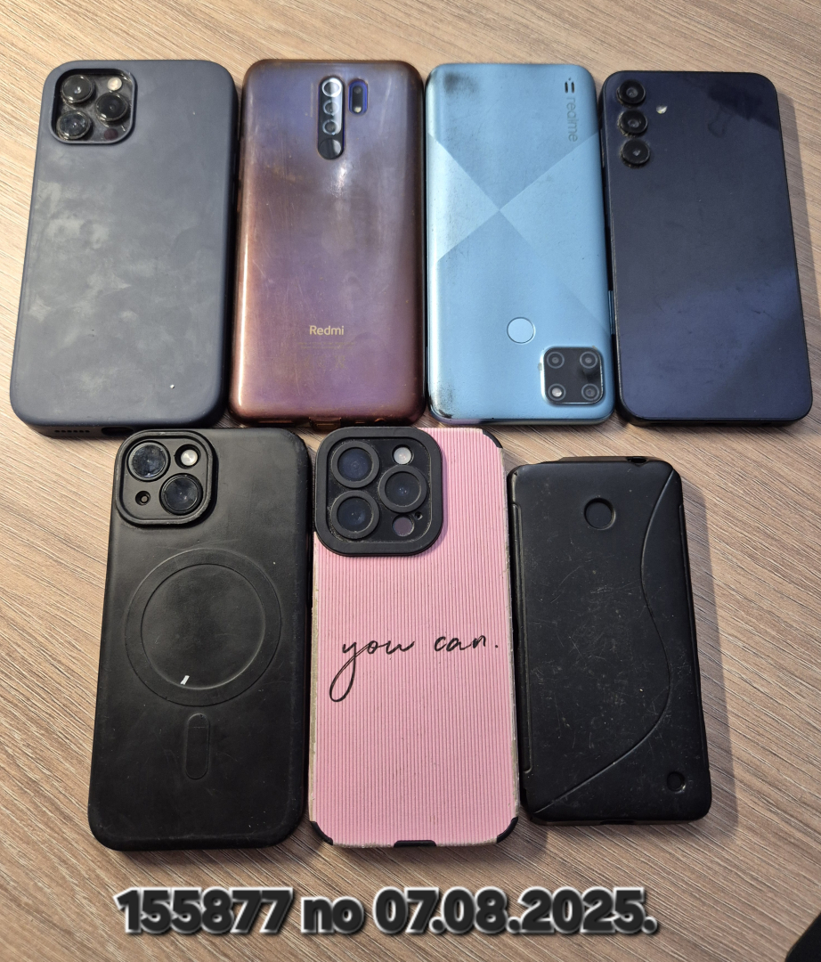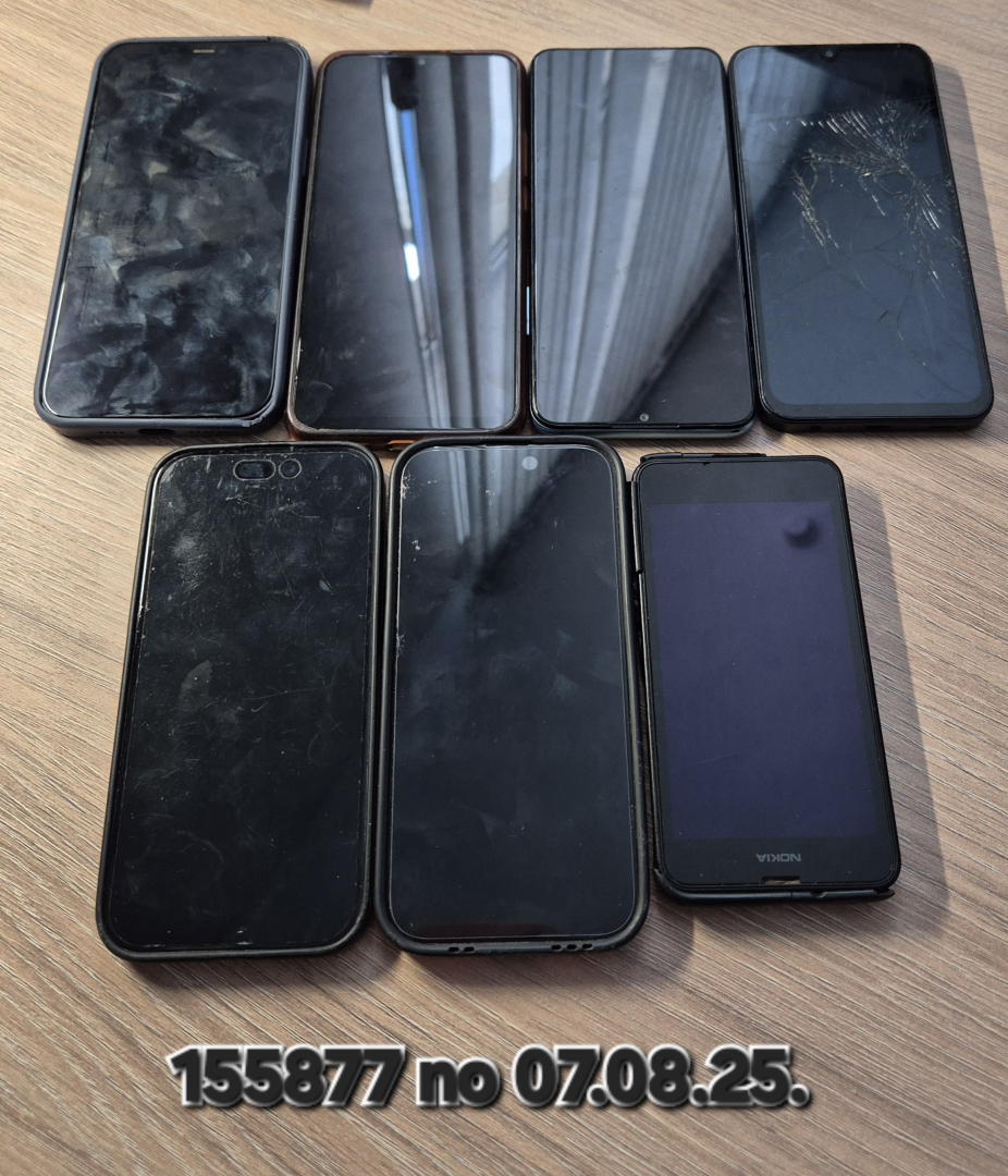 Tiek meklēti attēlā redzamo mobilo telefonu īpašnieki. Tie tika atrasti 07.08.2025. Stacijas laukumā 2, Rīgā.